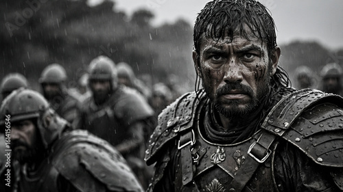 Medieval Warrior in Armor Leading Soldiers in Rainy Battle
