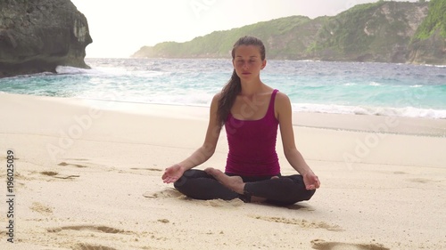 Meditating in lotus position, doing yoga exercises in morning on beach