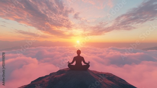 Meditating silhouette above clouds at sunset.