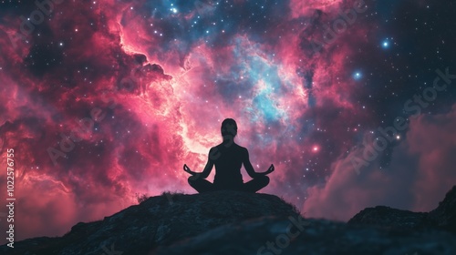 Meditation in cosmic space, silhouette against vibrant nebula and stars