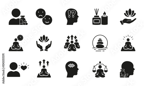 Meditation Practice Yoga and Zen Silhouette Icon. Healthy Lifestyle Icon. Wellness Icon Set. Relaxation, Meditation and Aromatherapy Pictogram. Isolated Vector Illustration