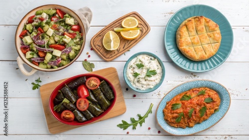 Mediterranean Cuisine A Table of Delicious Dishes Featuring Fresh Vegetables, Herbs, and Savory Baked Goods