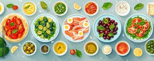 Mediterranean dishes, vibrant and fresh, flat design illustration