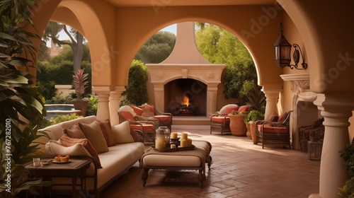 Mediterranean inspired outdoor living room with arched walkways shaded loggias terra cotta tile stucco columns and lush landscaping all around.