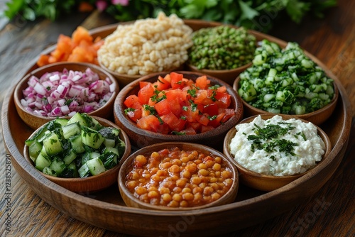 Mediterranean mezze platter, healthy food, wooden table, vibrant colors, restaurant menu