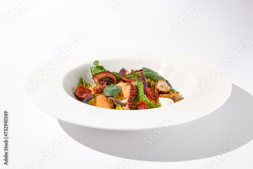 Mediterranean salad with octopus, potatoes, tomatoes, and Kalamata olives with a spicy sauce