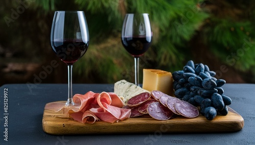 Mediterranean starter wooden board, cold cuts, sausages and cheese with red wine