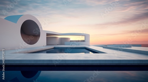mediterranean sunrise time at a white house with swimming pooh.