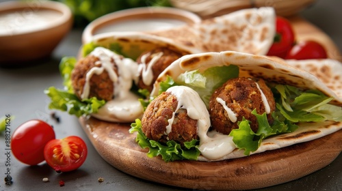 Mediterranean-style falafel sandwich with tahini sauce, lettuce, and tomatoes in pita bread