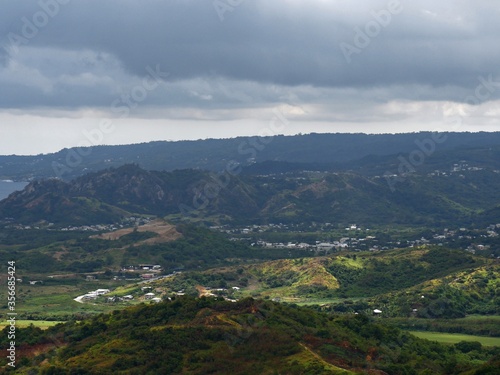 Medium close up of the eastern side of Barbados in the Caribbean Islands, with houses spread out beyond the valleys and hills