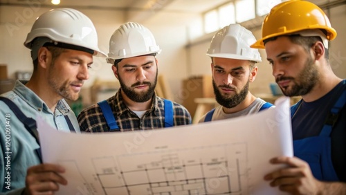 Medium closeup of a group of workers gathered around a large blueprint their faces reflecting concentration as they discuss assembly techniques over the intricate design.