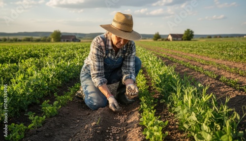 Medium shot of a farmer planting legumes in a prepared field showcasing nitrogenfixing plants as a key component of sustainable crop rotation systems.