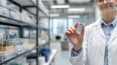 Medium shot of a technician in a medical lab presenting digital pill sensor usage focusing on the sensor in hand while equipment and shelves remain softly blurred.