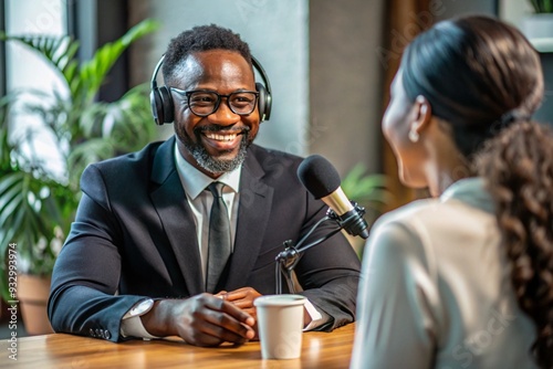 Medium shot of cheerful African American man wearing glasses and black suit talking to unrecognizable female guest sitting at table during podcast in studio