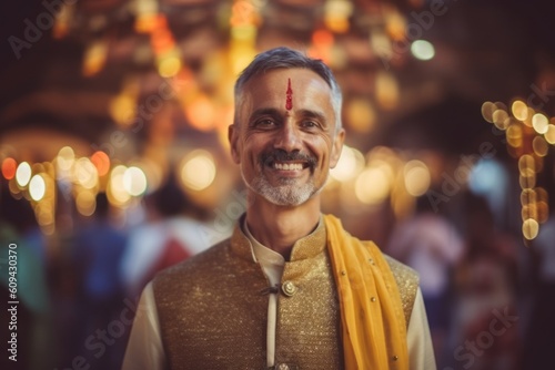 Medium shot portrait photography of a grinning man in his 40s that is wearing a chic cardigan against a traditional indian wedding celebration background . Generative AI