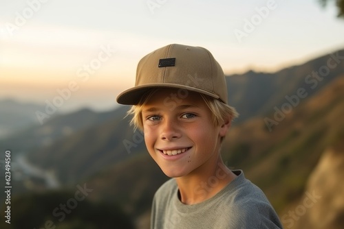 Medium shot portrait photography of a happy boy in his 30s wearing a cool cap or hat against a scenic mountain overlook background. With generative AI technology