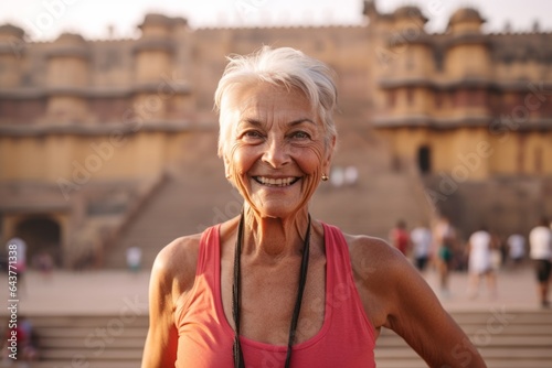 Medium shot portrait photography of a joyful mature woman wearing a stylish sports bra at the amber fort in jaipur india. With generative AI technology