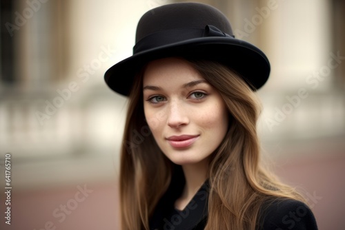 Medium shot portrait photography of a satisfied girl in his 20s wearing a charming cloche hat at the buckingham palace in london england. With generative AI technology