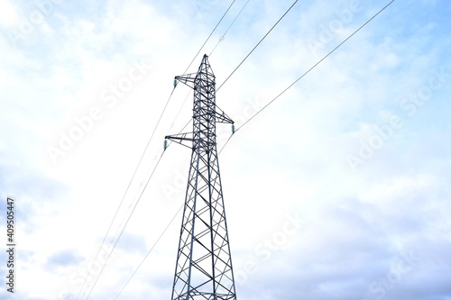 Medium voltage electricity tower on the mountain. Blue sky background with clouds.