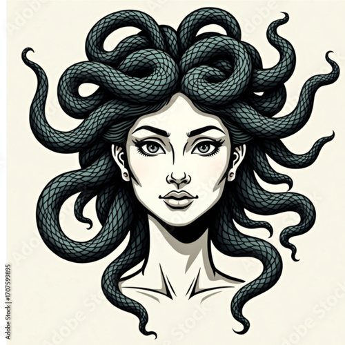 Medusa Illustration: An artistic illustration of the infamous Medusa, showcasing her iconic serpent hair and captivating gaze, evoking a sense of ancient mythology and power.