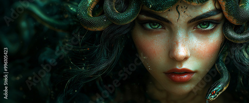 Medusa with snakes in her hair, featuring green and red colors against a dark background. Fantasy art style