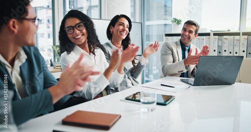 Meeting, applause and group with laptop, business and smile for celebration of financial performance. Achievement, clapping and people with tech for investment, accountant and success in boardroom