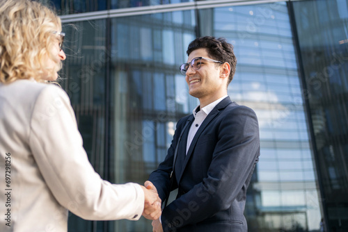 Meeting business young people managers, male and female partners go to the office to work, colleagues in business clothes, positive employees.