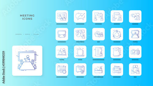 Meeting icon collection with blue gradient outline style. training, video, leadership, chat, member, cooperation, handshake. Vector Illustration