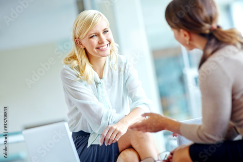 Meeting, smile and women in office for help, advice and brainstorming company development. Staff, happy and discussion for planning with problem solving, business growth and feedback in partnership