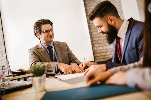 Meeting with agent in office, buying renting apartment or house, buyers of real estate ready to conclude a deal.