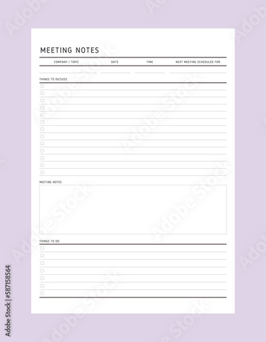 Meetings Notes Planner. Minimalist planner template set. Vector illustration.
