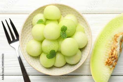 Melon balls in bowl and fresh fruit on wooden table, top view