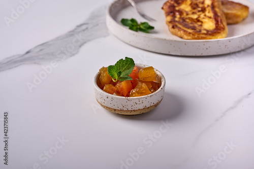 Melon jam with mint in a small bowl on a light background. In the back is Torrihas. Copy space