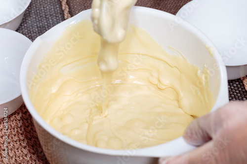 Melted white chocolate in a white plastic bowl.