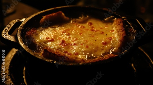 Melty cheese dish served in a cast iron pot with crusty bread on a rustic table