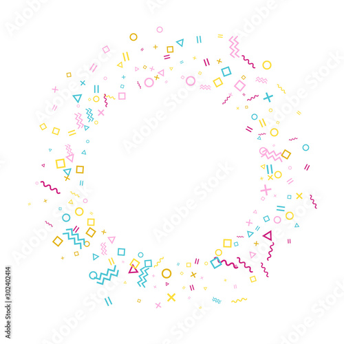 Memphis style geometric confetti vector background with triangle, circle, square shapes, zigzag and wavy line ribbons.