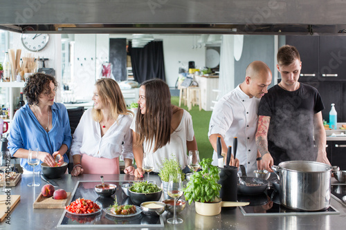 Men cooking and women talking and smiling in modern kitchen