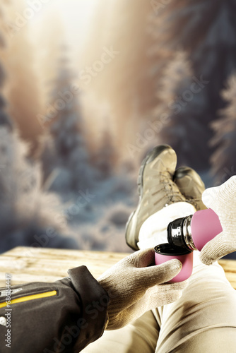 Men hands with thermos and legs with brown shoes. Free space for your decoration.