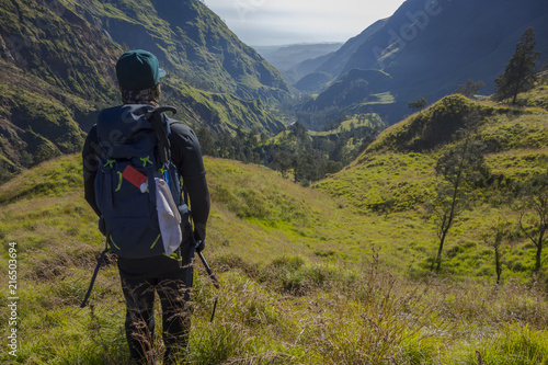 Men hike at Rinjani mountain range, Lombok, Indonesia.