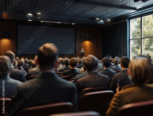 Men in suits attending a business meeting or seminar in a conference room with rows of chairs, listening to speaker at a podium.