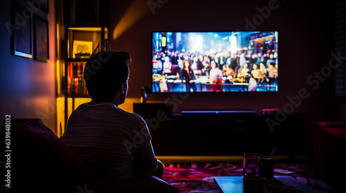 Men sitting in front of his TV at night, over the shoulder point of view, dim light and blurred background. Concept of binging and streaming. Shallow field of view.