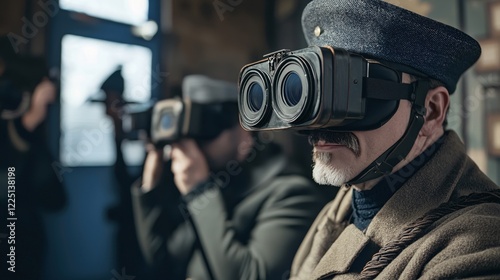 Men wearing virtual reality headset in vintage military uniform looking into the future