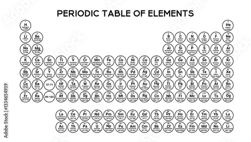 Mendeleev inspired black periodic table with minimalistic icons, featuring metals, gases, and halogens. Great for educational and scientific use.
