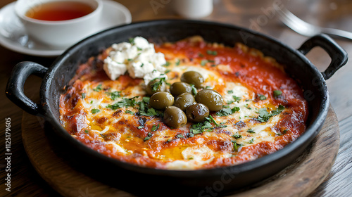 Menemen dish with a side of olives, feta cheese, and a cup of Turkish tea