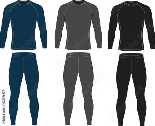 Men's compression base layer set, athletic long sleeve top and leggings front view, sportswear cad drawing flat vector illustration
