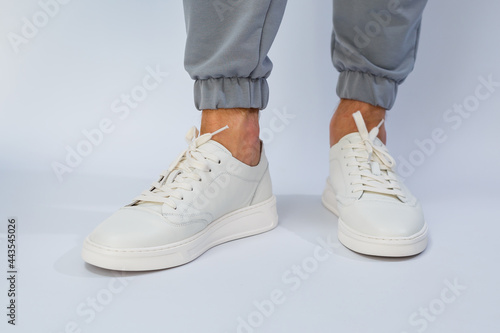 Men's feet in white everyday sneakers made of natural leather on lacing.