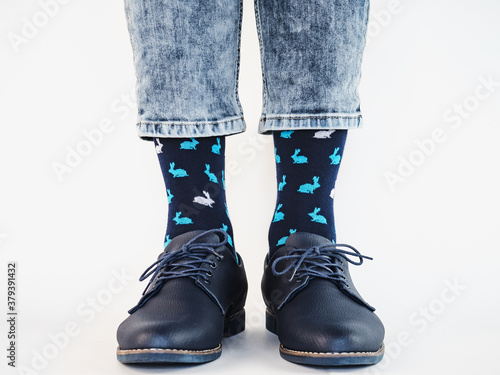 Men's legs, trendy shoes and bright socks. Close-up. Style, beauty and elegance concept