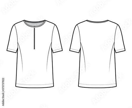 Men's style cotton-jersey top technical fashion illustration with short sleeves, scoop henley neckline with zip, loose fit. Flat outwear apparel shirt template front, back, white color. Women, unisex