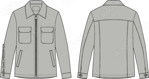 Men's utility jacket cad flat sketch, front and back view, technical fashion illustration, vector template, garment design, zipper closure, details