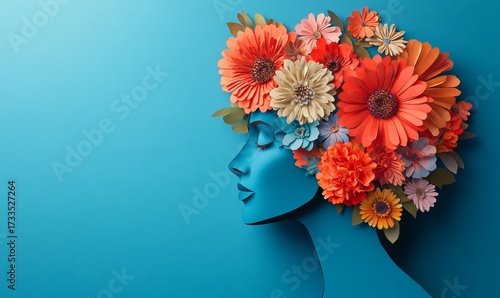 Mental health awareness campaign image featuring a paper cutout of a woman's head filled with flowers against blue background. The design highlights themes of well-being, self-care, Generative AI